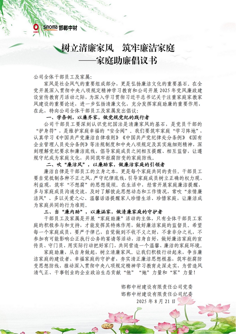 家风是社会风气的重要组成部分,8月21日,公司党委、纪委以党支部、中层干部企业微信群、公司内外网形式向全体干部员工及家属发出诚挚倡议:树立清廉家风 筑牢廉洁家庭——《家庭助廉倡议书》,倡议大家传承好家风,教育引导干部员工家属常吹“亲情廉洁风”,做好廉洁家庭的宣传员、监督员和守门员,当好“廉内助”,切实把好家门,筑牢拒腐防变的第一道防线。